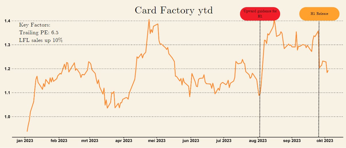 Card Factory PLC, similar to Eurosnack, reported an excellent first half (H1) performance. However, the stock subsequently traded down upon the release of the report. Card Factory reported an 11.5% year-over-year (YoY) growth for H1, which included a 10% increase in like-for-like (LFL) sales in their retail stores, and notably, a 13.1% LFL growth in the gifting category, one of their major strategic initiatives. So, why is the stock down? While we can't know for sure if it's the sole reason, the largest shareholder, Teleios Capital Partners LLC, has been selling their shares quite indiscriminately. After the report, shareholders were notified that Teleios reduced their share holdings from 14.9% to 11.7%. Teleios has been selling for some time, also divesting 5% of their shares in the past to JP Morgan.