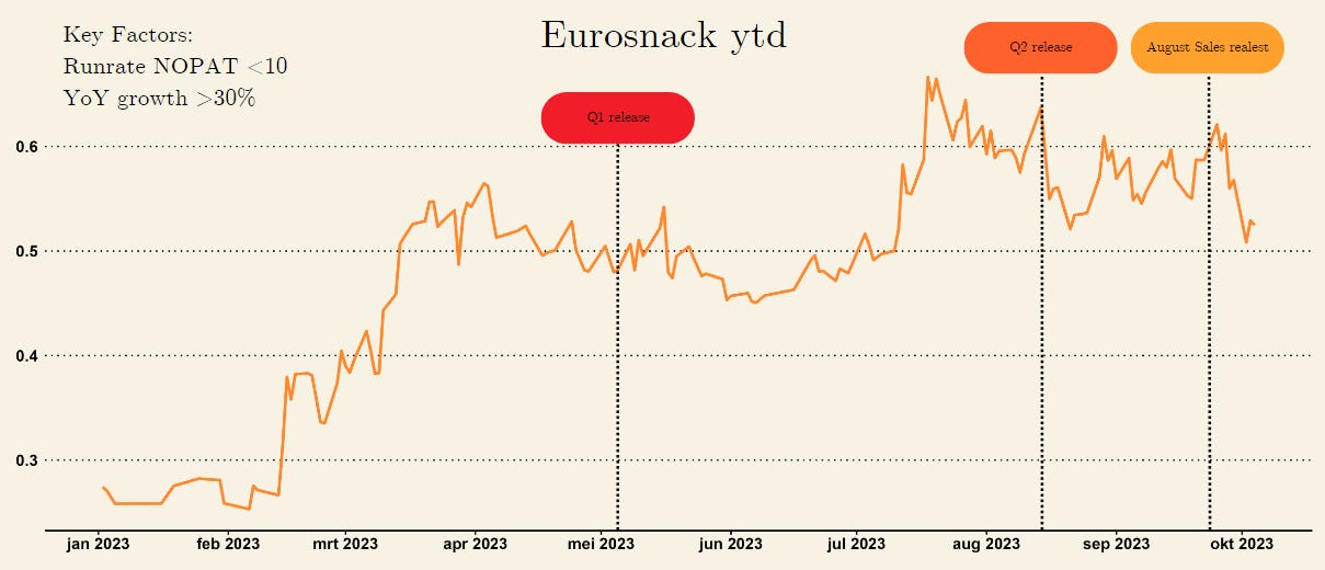 Let's begin with the standout performer year to date, Eurosnack S.A. This Polish company specializes in the production and distribution of salty snacks and biscuits. My initial pitch for Eurosnack was straightforward: it was (and still is) undervalued, considering its impressive growth trajectory. I believed that its margins were temporarily compressed due to short-term cost inflation, and there were additional opportunities for margin expansion as the company continued to scale.
